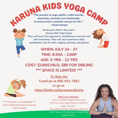 Having a hard time trying to find things for your kids to do later in the summer? Well, sign them up to have fun learning about yoga, mindfulness, self-awareness, and meditation! They'll enjoy fun yoga poses, games, arts & crafts, singing and dancing!